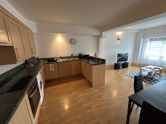 First floor Flat 3: Entrance Hall with electric door intercom system; Open plan Sitting Room/Kitchen with modern MDF base and wall units and windows overlooking central atrium; Bathroom with modern white wc, wash hand basin, bath with overhead shower and part tiled walls; Bedroom. This flat has an electric heating and hot water system.